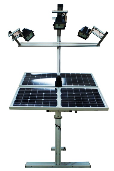1、光源模擬跟蹤裝置:由4塊太陽能電池板組件、3盞300W投射燈、追日跟蹤傳感器、水平和俯仰方向運動機構(gòu)、直流電動機和支架組成。