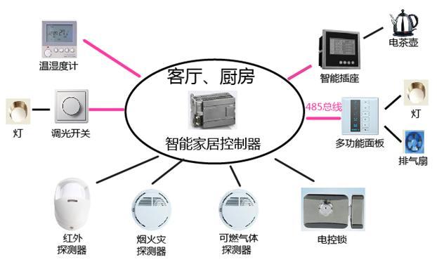 電控鎖通過智能家居控制器控制門的開啟;多功能面板控制客廳、廚房燈的開關(guān);智能調(diào)光開關(guān)調(diào)節(jié)LED燈的亮度、也可通過485總線與智能家居控制器通訊,通過情景模式智能調(diào)節(jié)LED燈的亮度;智能光強(qiáng)及溫濕度計(jì)顯示采集客廳溫濕度及光照度;智能插座控制和采集電茶壺的電源和電量信息,可合理分配用電負(fù)荷;可燃?xì)怏w探測器、煙火災(zāi)探測器及紅外探測器用于組件家居系統(tǒng)的安防系統(tǒng)。