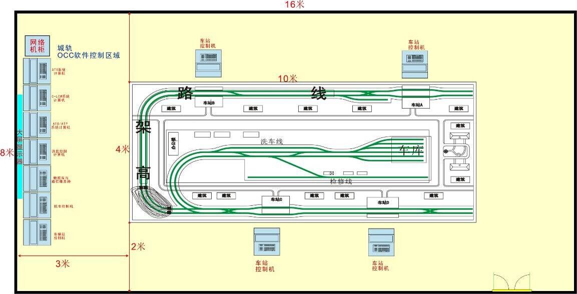 OCC實(shí)訓(xùn)系統(tǒng)配備數(shù)據(jù)庫(kù)、通信服務(wù)器、車(chē)輛段控制各1臺(tái),機(jī)車(chē)遠(yuǎn)程控制終端電腦1臺(tái)(安裝機(jī)車(chē)控制系統(tǒng),用于遠(yuǎn)程操控列車(chē)),調(diào)監(jiān)控制計(jì)算機(jī)1臺(tái)(操控大屏幕顯示系統(tǒng)),安裝ATS子系統(tǒng)、ATP/ATO子系統(tǒng)、C_LOW系統(tǒng)的中心控制計(jì)算機(jī)各1臺(tái)(完成運(yùn)營(yíng)調(diào)度、運(yùn)行圖編制與調(diào)整、命令下發(fā)、故障設(shè)置等功能)。OCC實(shí)訓(xùn)系統(tǒng)大屏幕顯示系統(tǒng)采用國(guó)際知名公司生產(chǎn)的LED背光拼接墻顯示器,由2*2拼接液晶大屏組成,可完整顯示全線路運(yùn)行狀況,也可分屏顯示列車(chē)進(jìn)站時(shí)的視頻圖像。