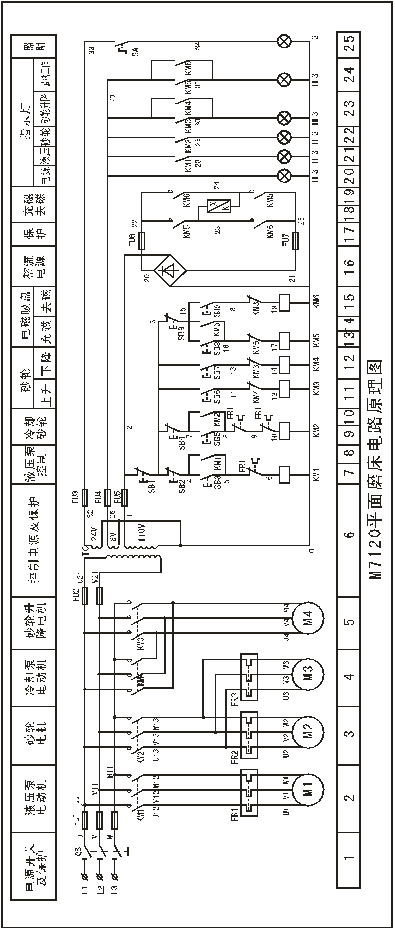 主電路共有四臺電動機,其中M1是液壓泵電動機,它驅(qū)動液壓泵進行液壓傳動,實現(xiàn)工作臺和砂輪的往復運動;M2是砂輪電動機,它帶動砂輪轉(zhuǎn)動來完成磨削加工工件;M3是冷卻泵電