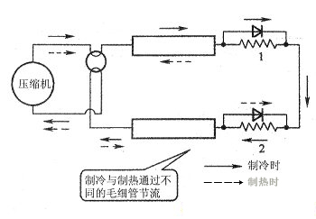 如下圖所示。在通過膨脹閥節(jié)流的熱泵型空調(diào)器中,一般有兩個單向閥和兩個膨脹閥。制冷時,只有制冷膨脹閥起作用,單向閥將制熱膨脹閥短路。制熱時,只有制熱膨脹閥起作用,單向閥將制冷膨脹閥短路。如果制冷正常,但不能制熱或制熱效果不好時,則應重點檢查制熱膨脹閥。故障原因一般是制熱膨脹閥損壞、堵塞或過熱度調(diào)節(jié)不當。