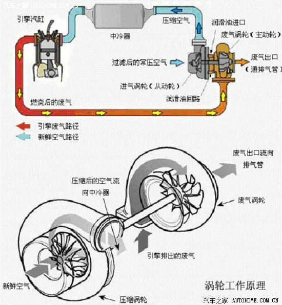 如果在相同的單位時間里,能夠把更多的空氣及燃油的混合氣強制擠入汽缸(燃燒室)進行壓縮燃爆動作(小排氣量的引擎能“吸入”和大排氣量相同的空氣,提高容積效率),便能在相同的轉(zhuǎn)速下產(chǎn)生較自然進氣發(fā)動機更大的動力輸出。渦輪增壓利用廢氣驅(qū)動,基本沒有額外的能量損耗(對發(fā)動機沒有額外的負擔),便能輕易地創(chuàng)造出大馬力,是非常聰明的設計。情形就像你拿一臺電風扇向汽缸內(nèi)吹,硬是把風往里面灌,使里面的空氣量增多,以得到較大的馬力,只是這個扇子不是用電動馬達,而是用引擎排出的廢氣來驅(qū)動。