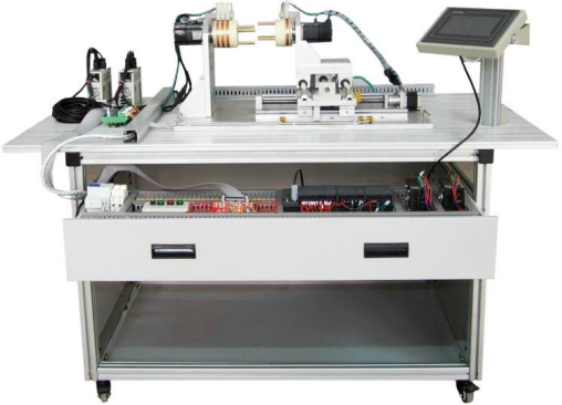 1.機構(gòu)部分:包括實訓桌、工業(yè)鋁型材、抽屜、二軸旋轉(zhuǎn)模型(含精密滾珠絲桿、主軸同步機構(gòu)、檢測傳感器、限位開關(guān))等組成。