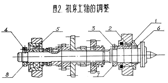 本機(jī)床主軸的回轉(zhuǎn)精度依靠控制其徑向跳動(dòng)及軸向竄動(dòng)來保證,徑向跳動(dòng)主要由主軸前端的雙列向心短圓柱滾子軸承保證,軸向竄動(dòng)則由尾端單列推力球軸承和單列圓錐滾子軸承保證。機(jī)床使用日久,軸承間隙過大上述各項(xiàng)精度不能滿足,則需分別對(duì)前后軸承進(jìn)行適當(dāng)調(diào)整,以消除其過大的間隙,但要注意,軸承間隙調(diào)整過小,會(huì)使主軸運(yùn)轉(zhuǎn)溫升過高等不正,F(xiàn)象發(fā)生。因此,調(diào)整后應(yīng)進(jìn)行主軸高速空運(yùn)轉(zhuǎn)試驗(yàn),l小時(shí)后測定軸承溫度不得超過對(duì)70C,“溫升不得超過40C,否則重新調(diào)整。基調(diào)整方法如下:(見圖2)
