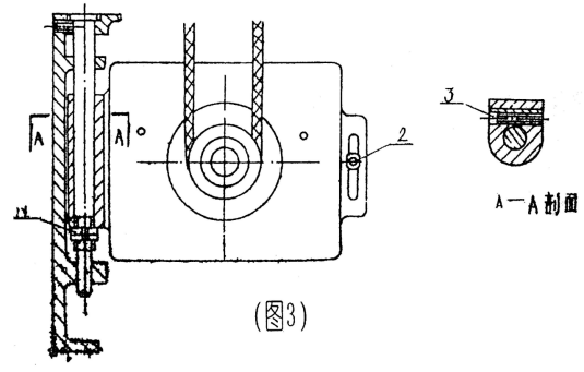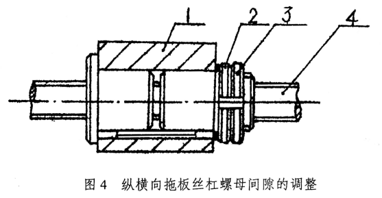機(jī)床使用日久,需要調(diào)整縱(橫)向絲杠一螺母間隙時(shí),首先將螺母3松開,然后稍微轉(zhuǎn)動(dòng)螺母2,使絲杠右螺母右移即可消除間隙,調(diào)整適當(dāng)后重新并緊螺母3。(見圖4)