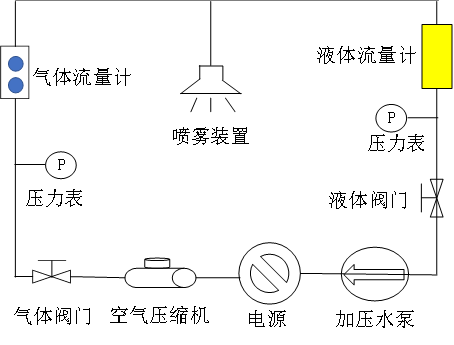 7、噴頭霧化形成模塊包括空氣壓縮機(jī)、高壓水泵、氣體及液體流量計(jì)。輸氣及輸水管線均采用直徑為12mm的空壓管,空壓機(jī)為實(shí)驗(yàn)提供壓縮空氣,壓力范圍為0~0.8MPa;高壓水泵(型號QL380A)提供壓力水,壓力范圍為0~6.0MPa。由空氣壓縮機(jī)及水泵分別用空壓管連接壓力表和流量計(jì),然后通過空壓管與霧化噴嘴(孔徑為1.5 mm)直接相連,通過調(diào)節(jié)氣壓閥和水壓閥,控制噴嘴的氣、水流量。