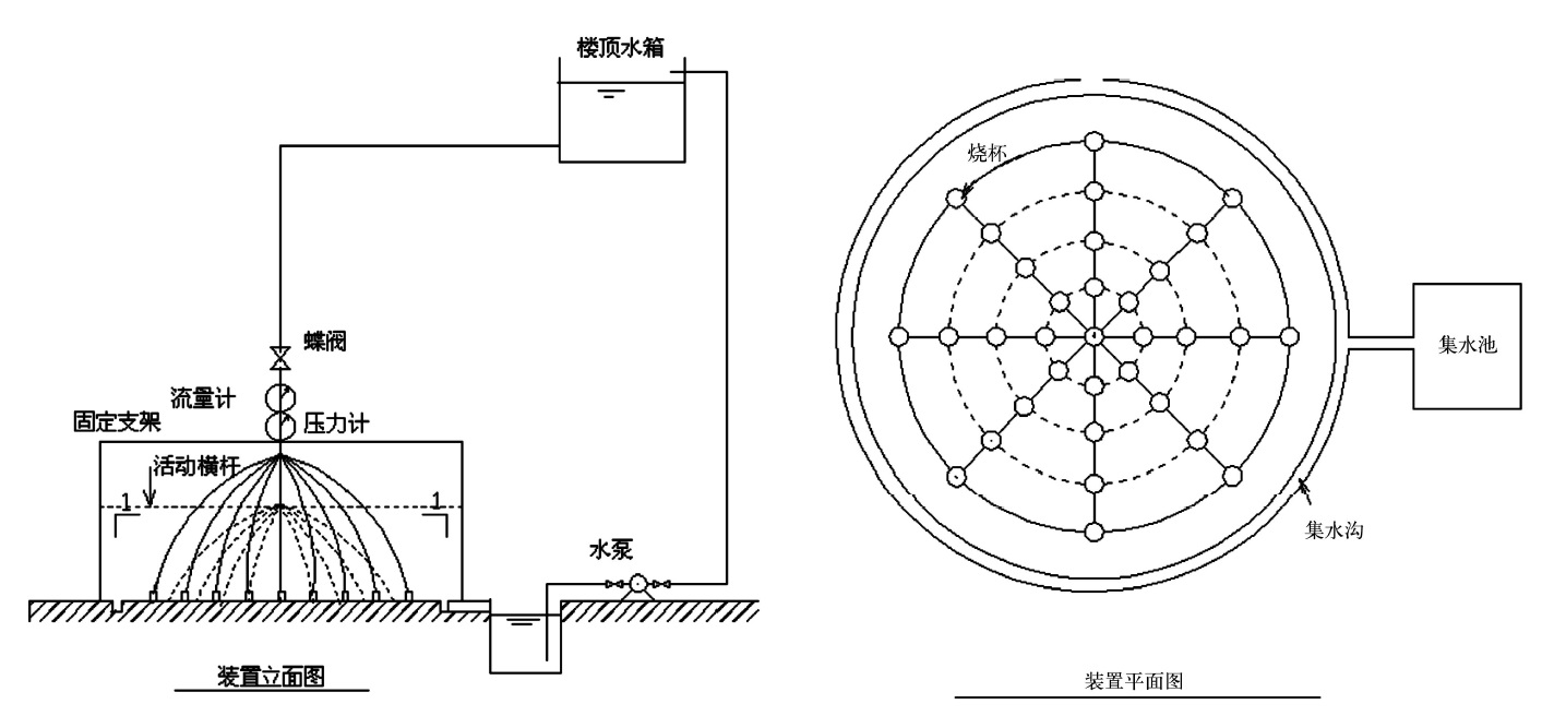 (2)固定噴頭作用高度H和噴頭出水流量Q,調(diào)節(jié)蝶閥改變噴頭出水壓力P,讀取壓力表和流量計讀數(shù),測量噴頭作用高度與噴頭保護(hù)面積半徑R及保護(hù)面積內(nèi)各點(diǎn)噴水強(qiáng)度qr。