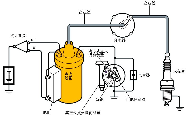 汽油機(jī)運(yùn)行時(shí)帶動(dòng)斷電器凸輪轉(zhuǎn)動(dòng),使斷電器不斷閉合與斷開,在觸點(diǎn)閉合式,蓄電池提供電流,電流從蓄電池正極經(jīng)點(diǎn)火線圈的一次繞阻、斷電器觸電,返回到蓄電池負(fù)極。電流流經(jīng)點(diǎn)火線圈的一次繞阻時(shí),鐵心中產(chǎn)生一個(gè)儲(chǔ)能用的強(qiáng)磁場(chǎng),當(dāng)斷電器觸點(diǎn)被頂開時(shí),一次電流迅速衰減以至消失,鐵心中的磁通隨之減小,而在二次繞阻中就感應(yīng)出點(diǎn)火所需的高電壓。這一電壓由高壓線輸送到分電器,在由此輸送到各個(gè)相應(yīng)的火花塞上,產(chǎn)生電火花。