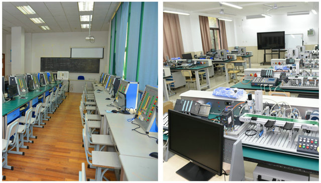 PLC控制實(shí)訓(xùn)室為機(jī)電技術(shù)應(yīng)用專業(yè)重點(diǎn)實(shí)訓(xùn)室。分為二個(gè)訓(xùn)練模塊:西門子S7-300系列PLC模塊和三菱FX2N-48MR系列PLC。模塊一實(shí)訓(xùn)室以簡(jiǎn)單一體化設(shè)備為載體,配置有西門子S7-300系列PLC、簡(jiǎn)單一體化裝置、STEP-7和博圖軟件。模塊二以PLC實(shí)訓(xùn)考核臺(tái)為載體,配置有三菱FX2N-48MR系列PLC和GX Developer軟件,承擔(dān)PLC相關(guān)教學(xué)任務(wù),還可承接上海市中小學(xué)職業(yè)體驗(yàn)項(xiàng)目。