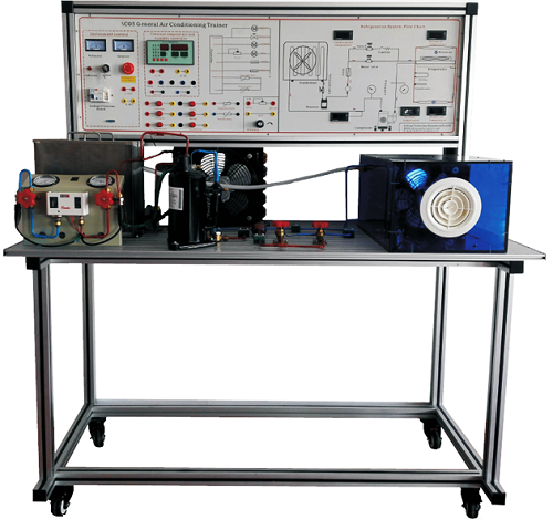 采用工業(yè)鋁型材結(jié)構(gòu)和亞光彩色噴繪結(jié)構(gòu),造型新穎。最上層布置空氣循環(huán)系統(tǒng),可直觀展示空氣處理機組結(jié)構(gòu);正面設(shè)有電源控制及測量儀表功能板。底部裝有四個帶剎車的萬向輪,便于移動和固定。