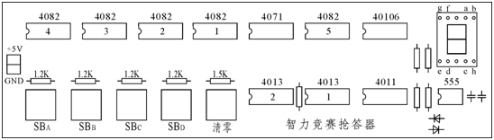 4個D觸發(fā)器的D端作為搶答操作狀態(tài)輸入,設(shè)A組先按按鈕,A組的D=1,在CP作用下,QA=1, =0。由于 =0,使門G1輸出為1,G2門輸出為0,封鎖了CP,使其他后按的D狀態(tài)傳不到Q端。當A輸出為1時,其他輸出為0,通過譯碼電路,使數(shù)碼管顯示“A”字符。字符顯示譯碼器的譯碼表如下。| QA QB QC QD | a b c d e f g |