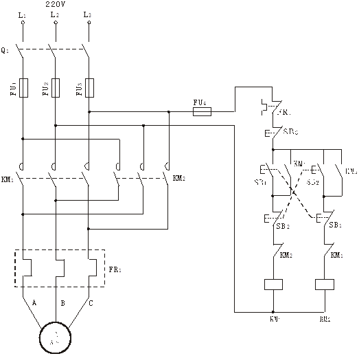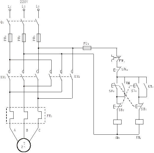 圖1 倒順開關(guān)正反轉(zhuǎn)控制線路