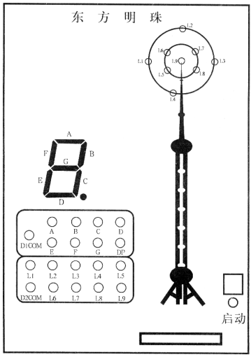 2.  本實(shí)驗(yàn)利用1個(gè)LED7段顯示數(shù)碼管和9個(gè)LED發(fā)光管來設(shè)計(jì)發(fā)射塔。數(shù)碼管顯示數(shù)字,發(fā)光管顯示信號(hào)輸出。