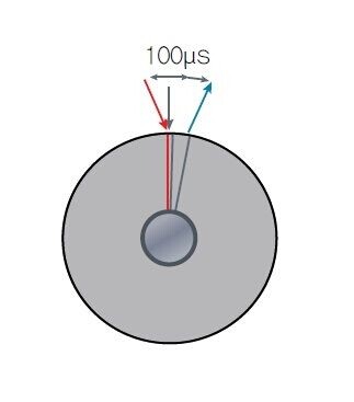 圖3顯示了動(dòng)態(tài)角度誤差的增加。假設(shè)芯片在轉(zhuǎn)子處于紅線位置時(shí)讀取磁場(chǎng)強(qiáng)度,且芯片在轉(zhuǎn)子轉(zhuǎn)動(dòng)時(shí)的傳輸延遲為100μs。當(dāng)芯片將磁場(chǎng)強(qiáng)度換算為角度時(shí),轉(zhuǎn)子用100?s的時(shí)間轉(zhuǎn)到了藍(lán)線位置——但芯片向ECU或MCU顯示轉(zhuǎn)子仍在紅線位置。