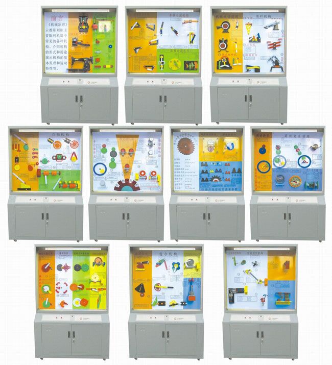 | 第五柜 齒輪傳動的各種類型 | 30、外嚙合直齒圓柱齒輪機構 31、內嚙合直齒圓柱齒輪機構 32、齒輪齒條機構 33、斜齒圓柱齒輪機構 34、人字圓柱齒輪機構 35、直齒圓錐齒輪機構、曲線圓錐齒輪機構 36、螺旋齒輪機構 37、螺旋齒輪齒條機構 38、圓柱蝸輪蝸桿機構、弧面蝸輪蝸桿機構 |