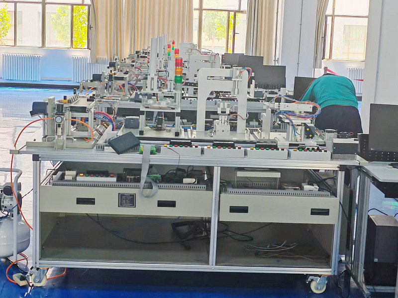 實(shí)訓(xùn)項(xiàng)目: 1、氣動系統(tǒng)的安裝與調(diào)試 (1)氣動方向控制回路的安裝 (2)氣動速度控制回路的安裝 (3)氣動順序控制回路的安裝 (4)氣動機(jī)械手的安裝 (5)氣動系統(tǒng)氣路的連接 (6)磁性開關(guān)的位置調(diào)整 (7)氣動系統(tǒng)調(diào)試 (8)擺動控制回路的安裝 2、變頻器的安裝與調(diào)試 (1)變頻器與交流電機(jī)主電路的連接 (2)變頻器面板的參數(shù)設(shè)置與操作 (3)變頻器面板控制交流電機(jī)調(diào)速 (4)通過變頻器外部端子控制電機(jī)啟停 3、機(jī)電設(shè)備的安裝與調(diào)試 (1)傳動裝置同軸度的調(diào)整 (2)皮帶輸送機(jī)的安裝與調(diào)整 (3)搬運(yùn)機(jī)械手設(shè)備安裝與調(diào)試 (4)物件分揀設(shè)備的安裝與調(diào)試 (5)送料設(shè)備的安裝與調(diào)試 (6)自動生產(chǎn)線設(shè)備安裝與調(diào)試 4、電氣控制電路的安裝與PLC編程 (1)電動機(jī)正反轉(zhuǎn)控制電路的連接與程序編寫 (2)電動機(jī)調(diào)速控制電路的連接與程序編寫 (3)皮帶輸送檢測程序編寫 (4)氣動順序動作控制程序編寫 (5)氣動機(jī)械手控制程序編寫 (6)機(jī)電一體化設(shè)備控制程序編寫 (7)自動生產(chǎn)線控制程序編寫 5、自動控制系統(tǒng)的安裝與調(diào)試 (1)多種傳感器的安裝與調(diào)試 (2)皮帶輸送檢測的自動控制 (3)機(jī)械手的自動控制 (4)機(jī)電一體化的自動控制 (5)PLC控制系統(tǒng)的安裝與調(diào)試 (6)自動生產(chǎn)線的安裝與調(diào)試 6、觸摸屏基本控制及設(shè)置 (1)觸摸屏的接線和基本參數(shù)設(shè)置; (2)基于觸摸屏控制方式的基本指令編程練習(xí); (3)PLC、觸摸屏與變頻器通信控制。 7.可用于考核或技能競賽,可考察的職業(yè)能力 (1)機(jī)械構(gòu)件的裝配與調(diào)整能力 (2)機(jī)電設(shè)備的安裝與調(diào)試能力 (3)電路安裝能力 (4)氣動系統(tǒng)的安裝與調(diào)試能力 (5)機(jī)電一體化設(shè)備的控制程序的編寫能力 (6)自動控制系統(tǒng)的安裝與調(diào)試能力 |
